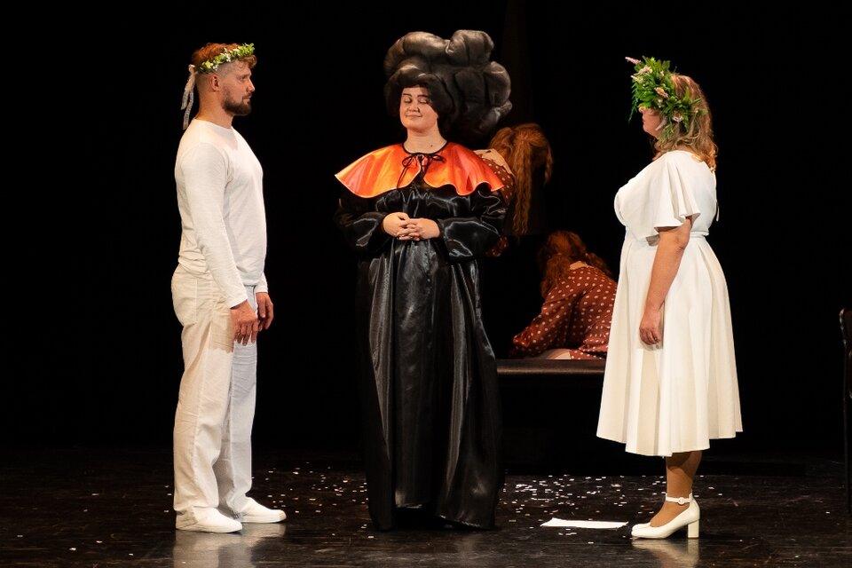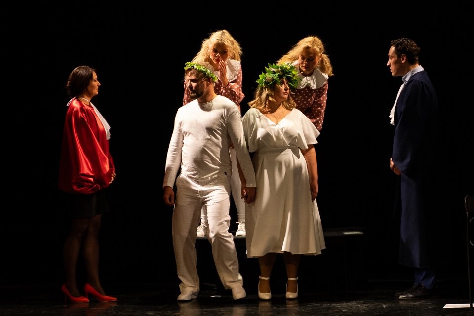 Пьесу «Адам женится на Еве» поставил с нашими актёрами режиссёр Антон Тимофеев по пьесе Руди Штраль. Молодые люди, которых по чистой случайности зовут Адам и Ева, страстно влюблены и очень хотят как можно скорее пожениться. Неожиданно Адам и Ева попадают не в обычный ЗАГС, а в суд, в котором представители закона помогут им принять решение об их дальнейшей судьбе. Дойдут ли молодые люди до свадьбы, или их чувства разрушатся в результате испытания? Ответ не очевиден. Ведь в этом условном судебном процессе на стороне обвинения — жизненный опыт и вполне рациональные и убедительные доказательства. О какой свадьбе может идти речь, когда Адаму через три месяца придётся идти в армию, а у Евы явно не складываются отношения с будущей свекровью. А ещё есть скелеты в шкафу, которые также станут достаточными причинами, чтобы отказаться от брака.