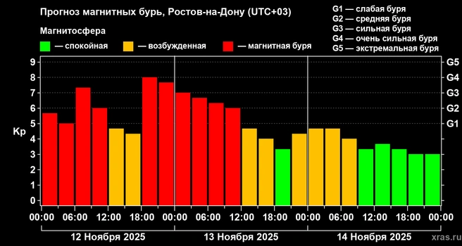 Утром магнитная буря в Воронеже достигла почти экстремального уровня (G5). Согласно прогнозу, к полудню буря должна была ослабеть, а потом снова усилиться — это продлится до середины 13 ноября, то есть и сегодня, в среду, и завтра, в четверг, у многих из нас будет болеть голова и ухудшится самочувствие.