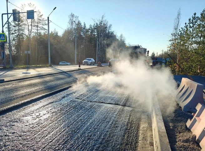 В районе «кольца» подрядчик добавил переходно-скоростную полосу, сейчас ведется устройство тротуара. При благоприятных погодных условиях в ближайшее время планируется установить барьерное ограждение, дорожные знаки и нанести разметку.